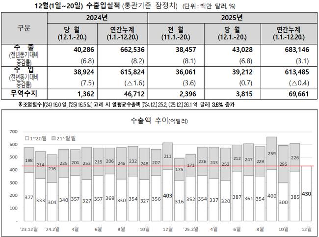 12월 1~20일 수출 430억달러…6.8%↑ 무역흑자 38억달러 - 수출·수입 모두 증가세…동기간 수출 실적 역대 최대 - 반도체·무선통신기기 견인, 승용차·에너지 일부 감소 - 연간 누계 수출 6,831억달러…흑자 696억달러