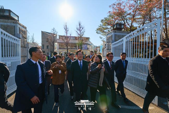 이 대통령은 이날 국무회의를 마친 뒤 김민석 국무총리와 구윤철 경제부총리, 위성락 안보실장, 김용범 정책실장 등 참모들과 함께 춘추관을 나서 삼청동 일대를 걸었다. 오가는 시민들과 손을 흔들며 인사를 나눴고, 미국에서 살다 한국을 방문했다는 한 동포 가족의 사진 촬영 요청에도 웃으며 응했다.